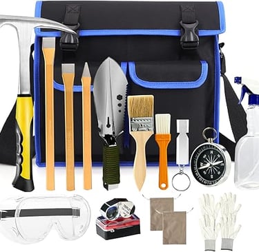 Kit geológico com martelo bússola, apito, cinzel